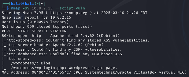 - Seguridad en WordPress: Aunque no se han detectado vulnerabilidades en el escaneo de Nmap, la presencia de WordPress nos indica que es importante realizar un análisis de vulnerabilidades en plugins y temas. Es importante realizar un escaneo más profundo y específico en WordPress, buscando versiones vulnerables de plugins o configuraciones inseguras.