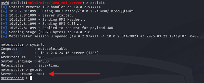Tras realizar la explotación, confirmamos que nos encontramos dentro de la máquina “Metasploitable” y somos el usuario “root”.