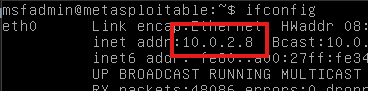 Primero para saber la IP de la máquina Metasploitable utilizamos “ifconfig”: