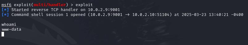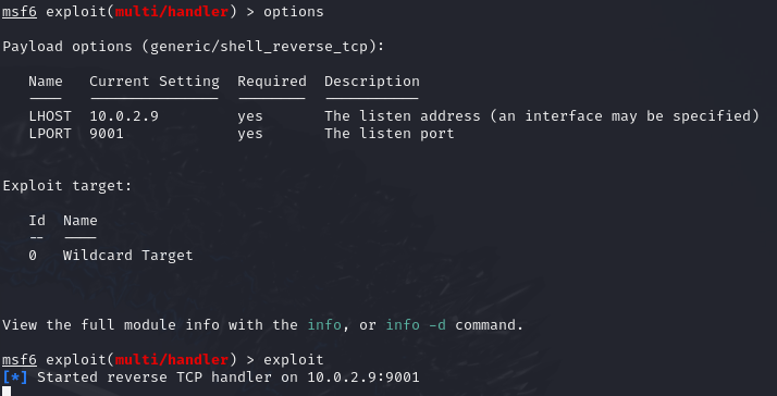 Bien, ahora que tenemos detectada la vulnerabilidad, vamos a explotarla para conseguir acceso remoto directamente desde nuestra temrinal. Para ello, crearemos una reverse Shell. Primero, pondremos Metasploit en modo escucha utilizando el módulo exploit/multi/handler de la siguiente manera: