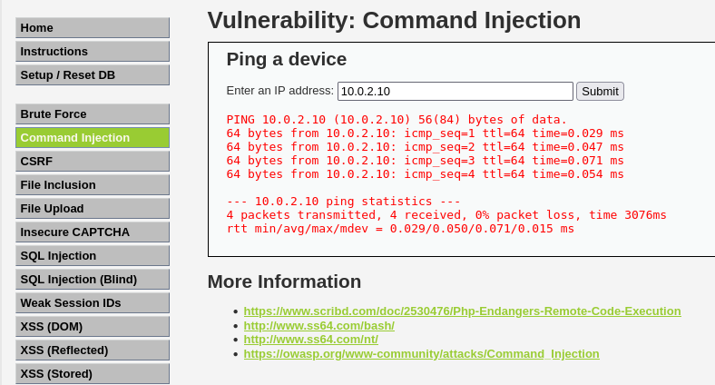 Anteriormente ya encontramos en esta máquina inyecciones SQL. Ahora vamos a intentar conseguir una ejecución remota de comandos utilizando metasploit. (Aunque hay muchísimas más vulnerabilidades ya que el entorno está creado con ese objetivo). Vamos a elegir el nivel de seguridad en “Low”. Y nos vamos a el apartado “Command Injection”.
