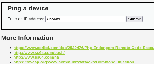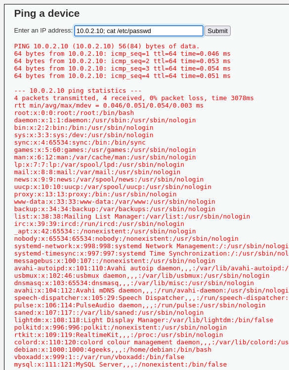 Rápidamente, descubrimos que la comprobación se puede vulnerar, ya que si después de la IP, escribimos “;”, podemos escribir después cualquier comando y se ejecutará, en este caso mostramos con “cat” el archivo /etc/passwd: