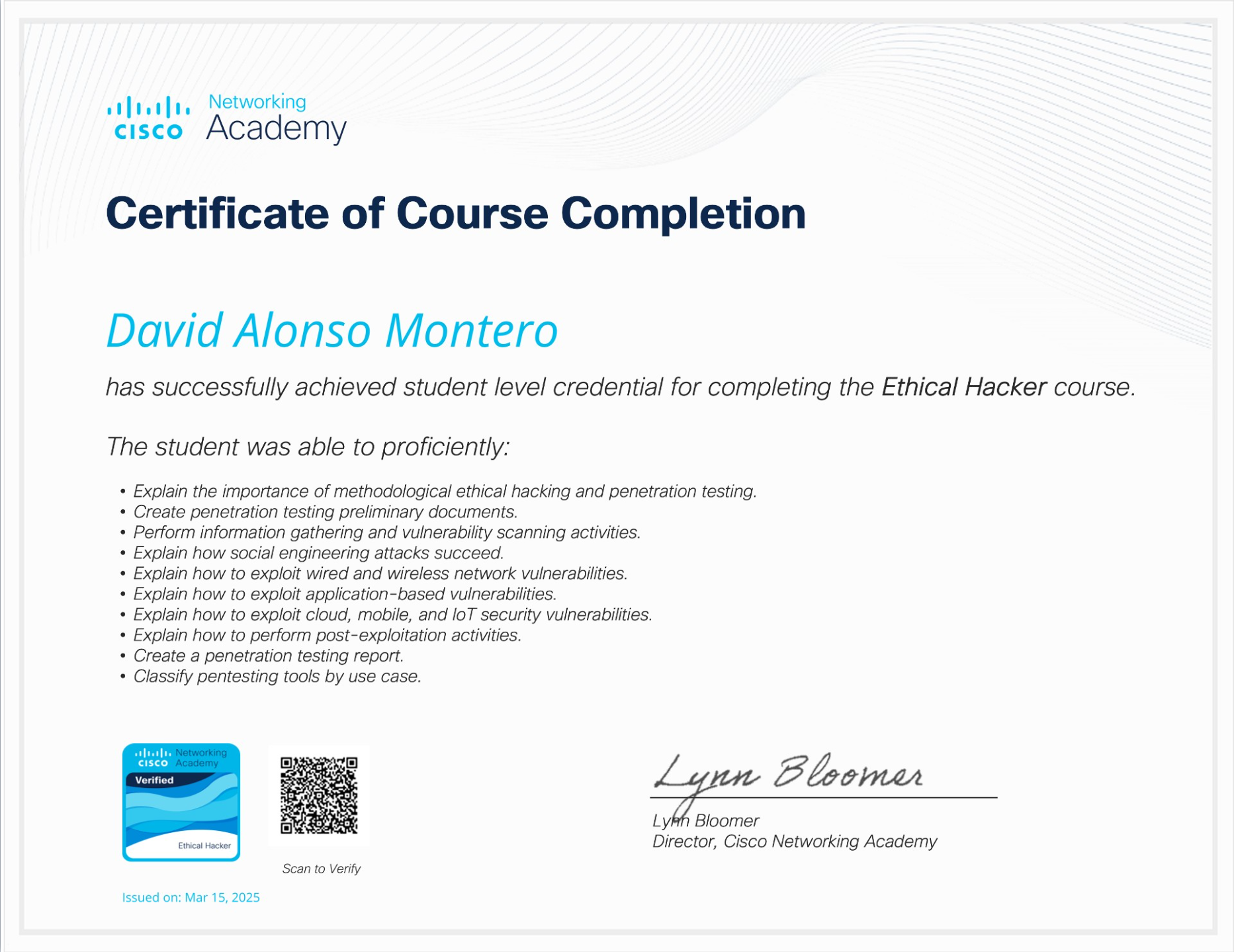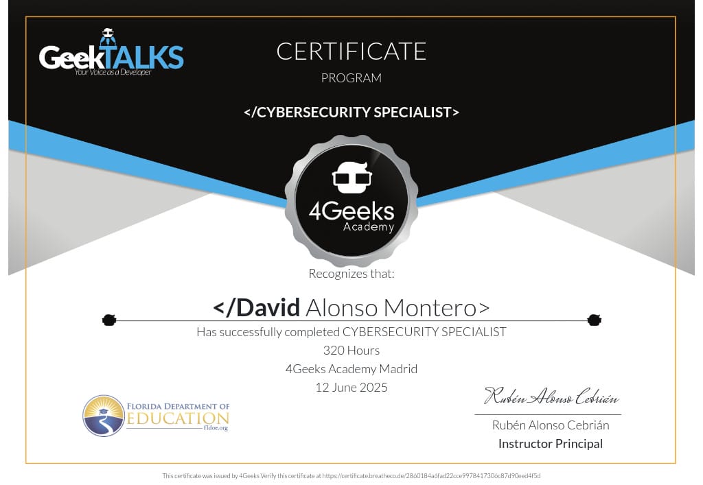 El titular de esta credencial tiene una amplia comprensión de los principios fundamentales y avanzados de la ciberseguridad, incluyendo protección de redes, administración segura de sistemas Linux y Windows, técnicas de pentesting ofensivo y defensivo, y análisis de inteligencia cibernética. Formado en estándares internacionales como ISO 27001 y NIST, y capacitado en herramientas líderes del sector como Nessus, Nmap, Wireshark y Metasploit, demuestra una preparación práctica y actualizada para anticipar, identificar y mitigar amenazas digitales en entornos complejos. Esta certificación, avalada por expertos como Chema Alonso y reconocida por instituciones educativas internacionales, acredita un perfil altamente competente y comprometido con la seguridad digital.