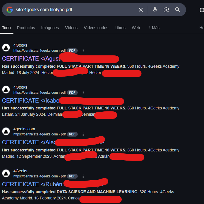 Me sorprendió encontrar más de 200 certificados de alumnos indexados en los resultados. Cada certificado contenía información privada que, idealmente, no debería estar accesible públicamente.