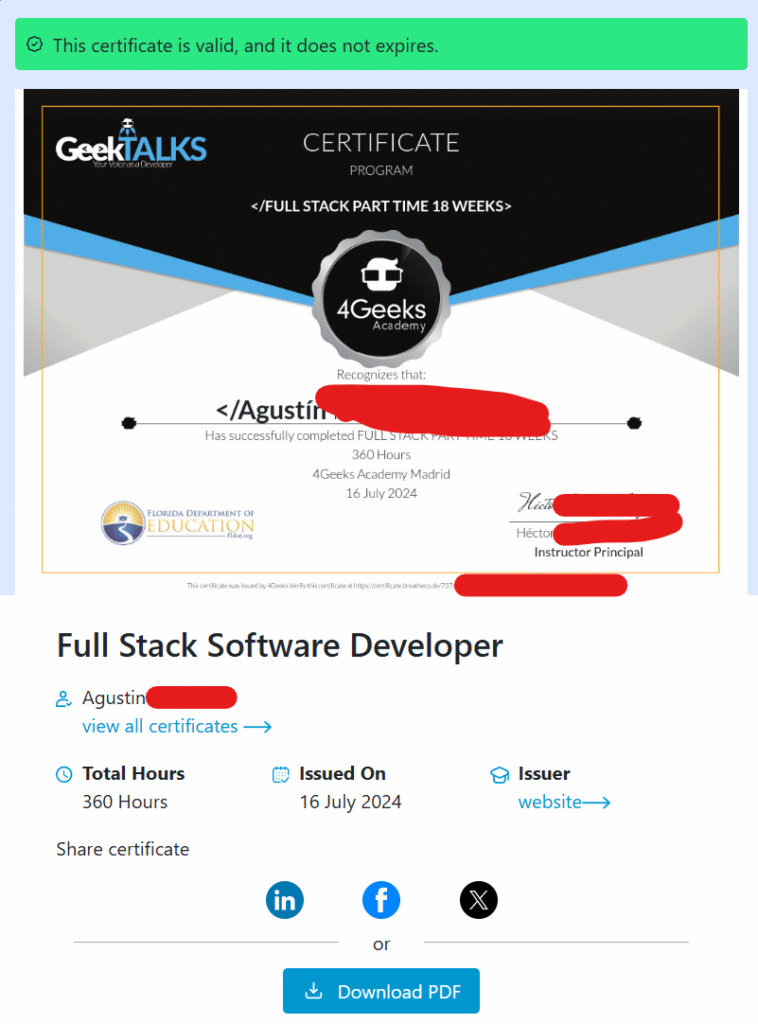 Esta URL llevaba a una página que validaba el certificado, mostrando información del alumno como su nombre, las horas de formación, la fecha de emisión y opciones para compartirlo en redes o descargarlo en PDF.