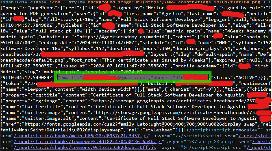 Al inspeccionar el código fuente de la página, encontré un bloque de datos estructurados en formato JSON. En esta sección aparecían detalles aún más sensibles, incluyendo el ID de usuario, Nombre, Apellidos, Email, Teléfono, datos relacionados con la academia y la especialidad del alumno.